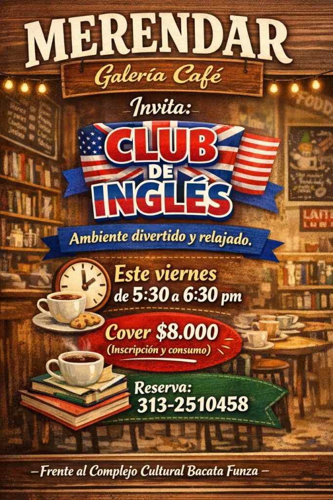 El club de inglés extiende la invitación a los interesados en el idioma inglés -cualquiera que sea su nivel de proficiencia- cuyo propósito es lograr expresarse de manera fluida con la ayuda de los mismos participantes. Para ello hemos diseñado dos sesiones de 30 minutos y un coffeebreak de 10 minutos. El cover de $8.000 incluye; inscripción o reserva de la clase y $5.000 de consumo. Este evento lo realizaremos cada quince día en las instalaciones de Merendar Galería Café Funza.